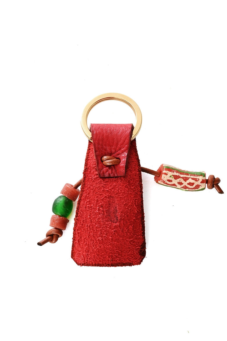 Carry keys with Ghanaian style, using this keyring adorned with a brass cowry shell charm and recycled glass beads. Fashioned from thick, quality leather, this key ring is handmade by artisans in Ghana. Sold singly. Because this is a handcrafted item, each will vary slightly. Dimensions: 3.5"L x 1.5"W x 0.5"H Crafted from: Leather, brass, recycled glass beads Made in: Ghana