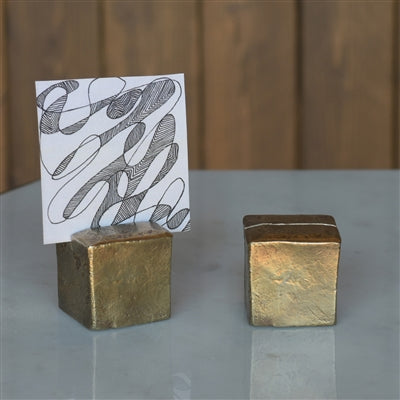 Cast of iron with a chiseled texture and brass plating. Our place card holders are a beautiful addition to a table scape, or a sweetly simple way to display a photograph or business card.