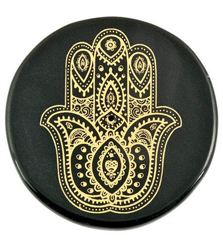 This handcrafted black agate incense burner features the protective Hamsa Hand symbol, a revered design in spiritual traditions worldwide. Measuring 3 inches in diameter, each piece is individually made in India from natural stone, ensuring unique variations in color and pattern. Perfect for burning incense, the tile doubles as an altar centerpiece or meditation focal point. Its grounding energy makes it ideal for healing rituals, spellwork, and spiritual practices including Wiccan ceremonies. The natural agate construction provides both functional beauty and metaphysical significance for your sacred space.