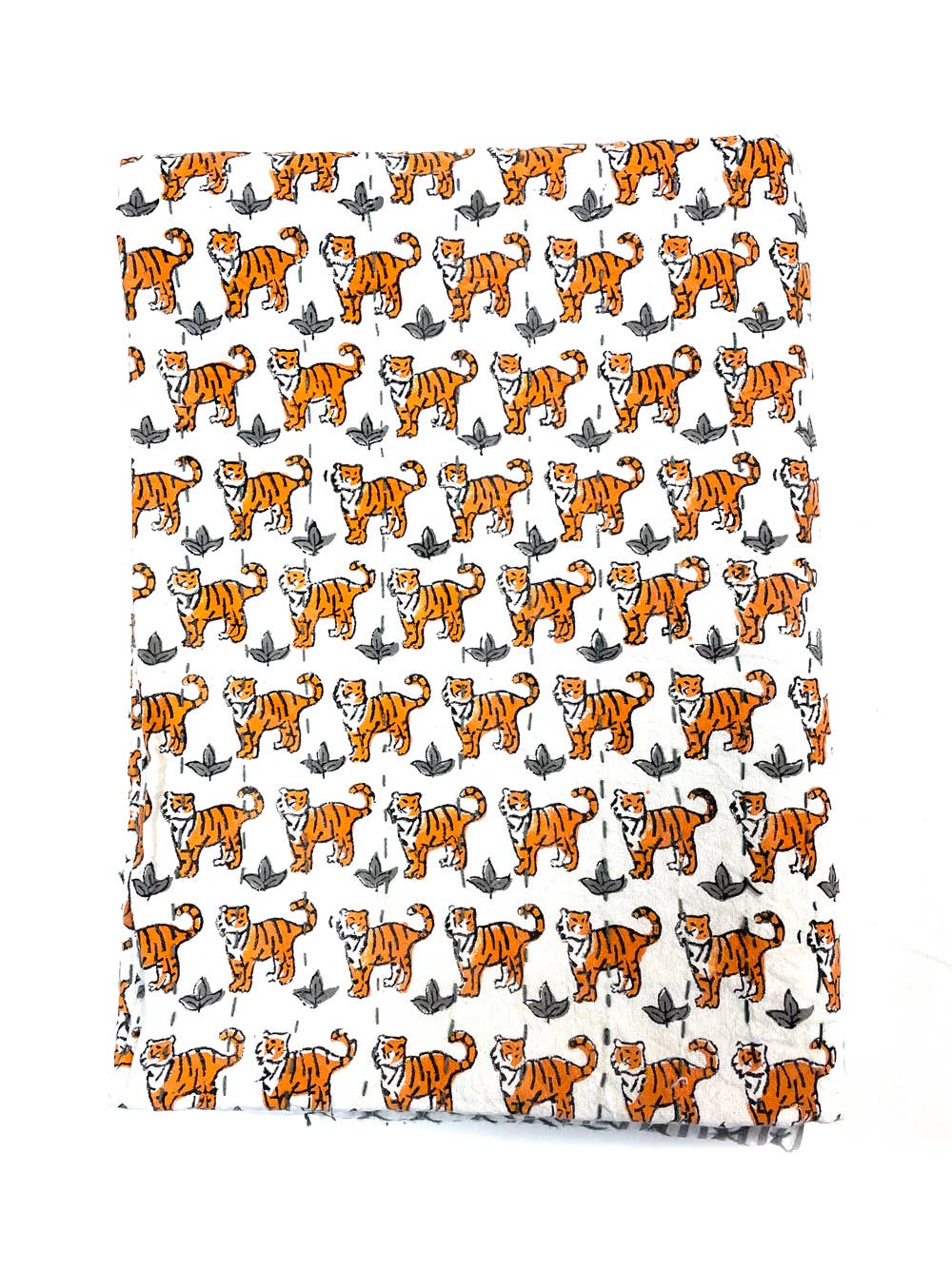 This beautiful block-printed Kantha blanket features adorable tigers in orange and gray. Block printing is a traditional form of art in India. Artisans stamp lengths of cotton fabric with color using hand-carved woodblocks. Many times, the prints are done in multiple layers. The outcome is a vibrant pattern which exemplifies the culture around it.