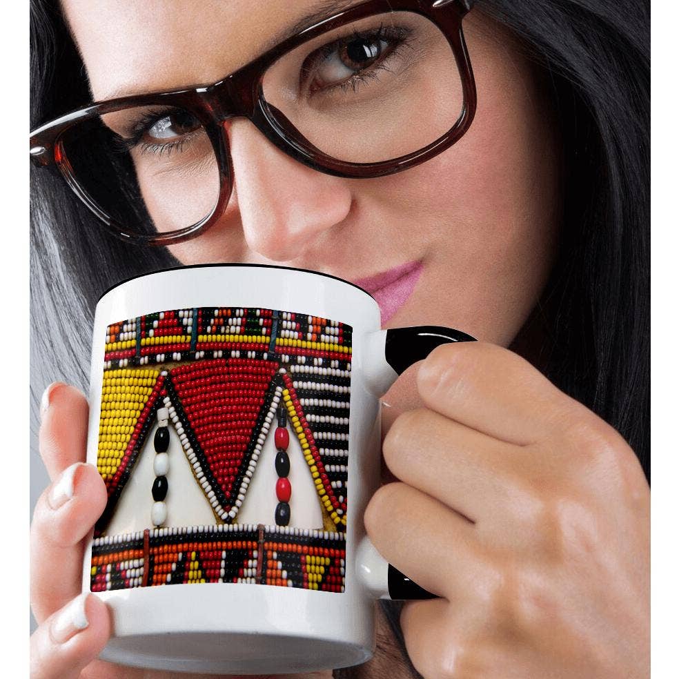Elevate your drinkware with this 15 oz. custom printed mug featuring authentic Maasai tribal beadwork from Kenya, Africa. Perfect as a reusable tea or beer mug, it combines cultural artistry with everyday practicality. Its large size makes it an ideal gift for men who appreciate unique design and function. Display it proudly or offer it as a thoughtful present. To maintain the vividness of the intricate pattern, hand washing is recommended. This mug transforms routine sipping into a vibrant cultural experience.