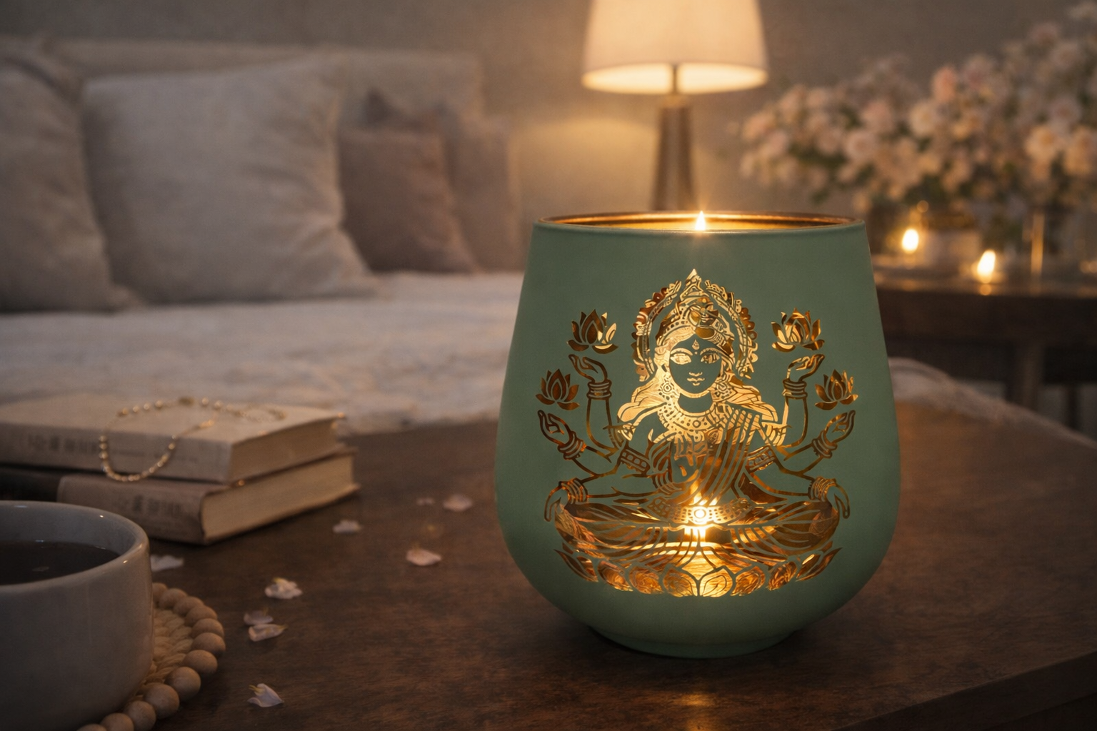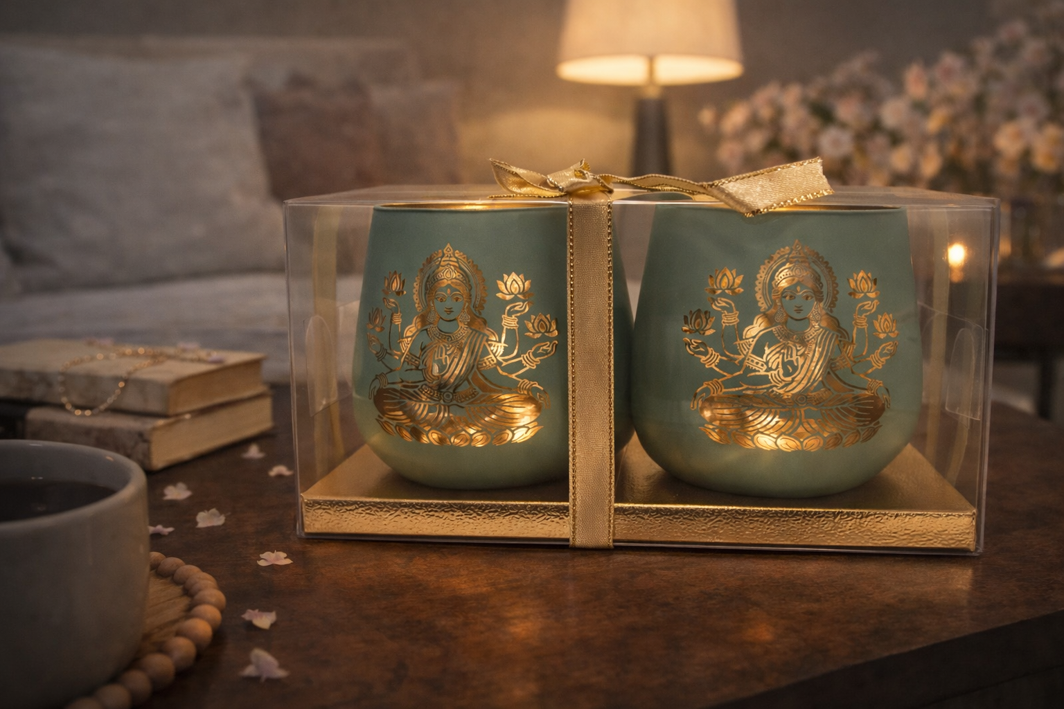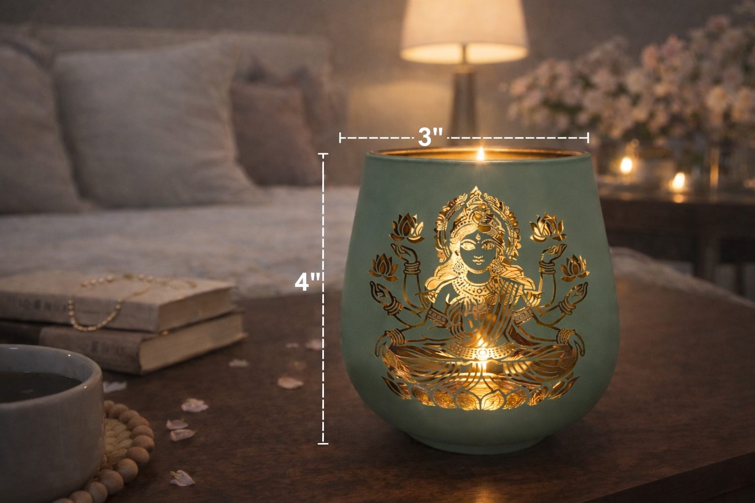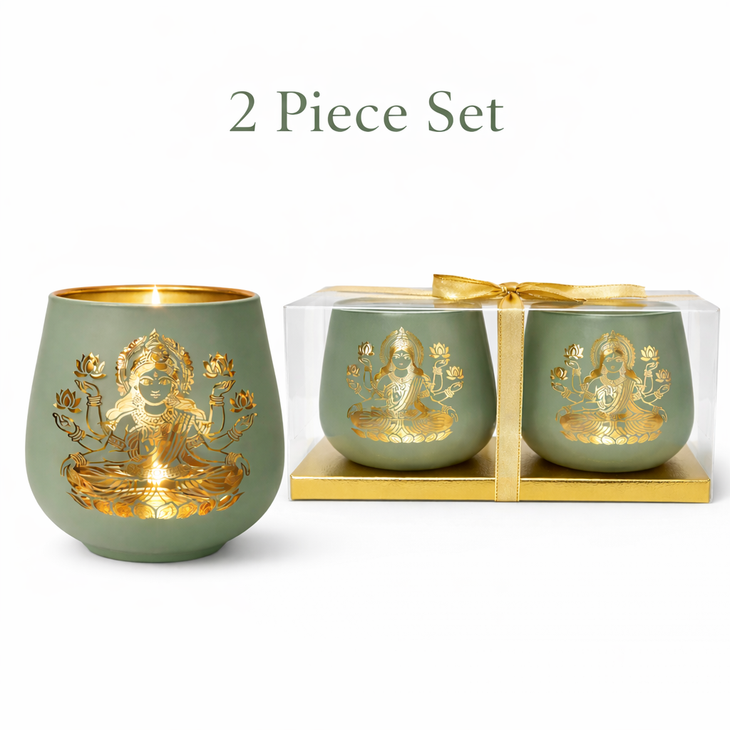 Bring sacred elegance to your home with this pair of Laxmi candle holders. Each 4-inch piece features the revered Laxmi motif, honoring the goddess of prosperity and abundance. Perfect for altar spaces, puja rooms, or as a meaningful tabletop accent, these holders create a spiritual focal point while supporting your daily practice. The compact size fits seamlessly on shelves and displays, while the pair format makes an thoughtful gift for those seeking to deepen their devotional space. Ideal alongside candles, bells, and other sacred home décor.