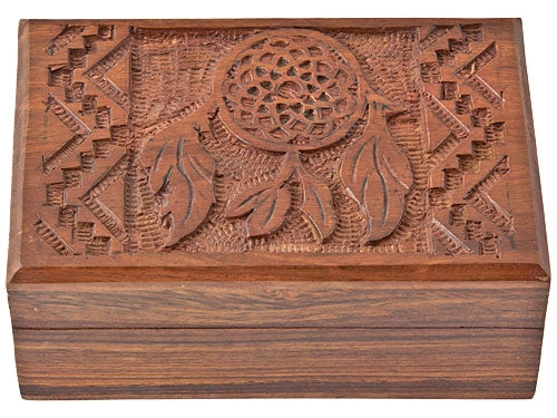This exquisite hand-carved wooden box showcases traditional Indian craftsmanship with an intricately detailed pentacle design. Measuring 4" x 6", it serves as an elegant storage solution for jewelry, keepsakes, or small treasures. The natural wood grain and precise carving create a distinctive aesthetic that blends spiritual symbolism with functional artistry. Perfect for collectors of global artisan pieces or as a meaningful gift for those drawn to metaphysical décor.